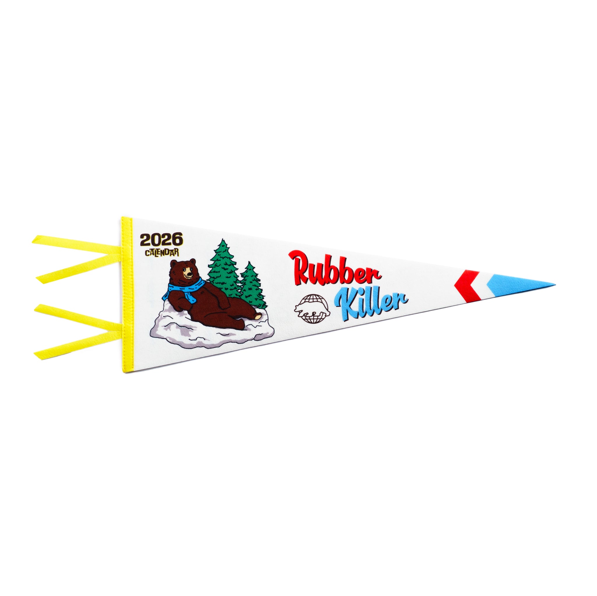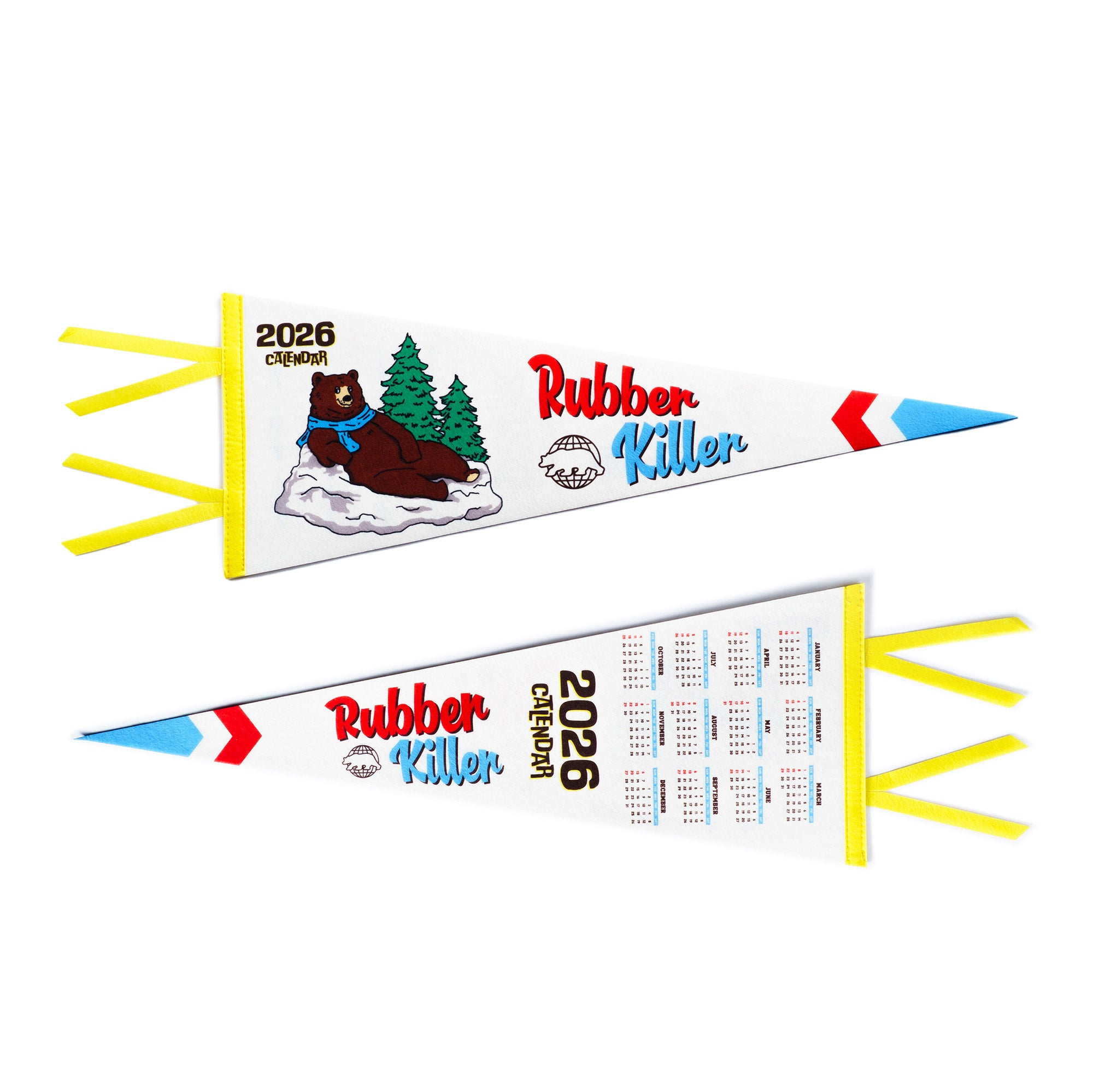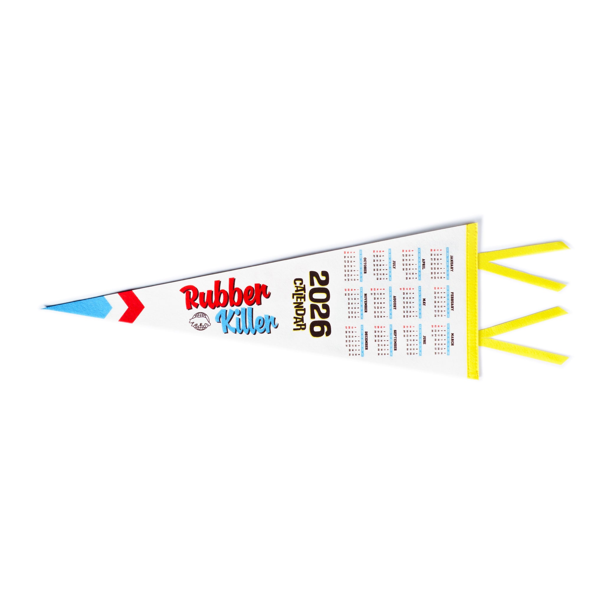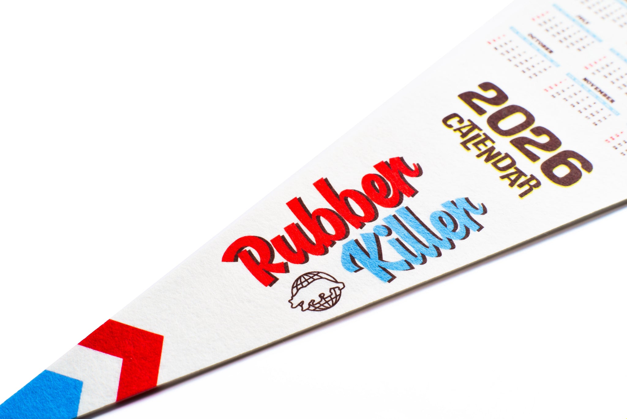 The 2026 Rubber Killer Calendar features a unique pennant-style design, made from high-quality soft felt with vibrant print. Lightweight and easy to hang, it’s perfect as a decorative wall piece.